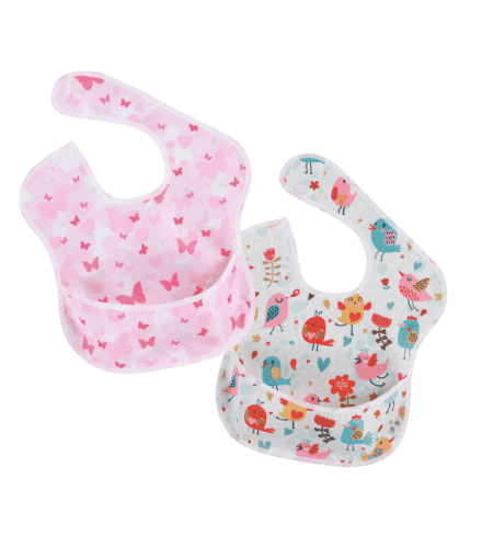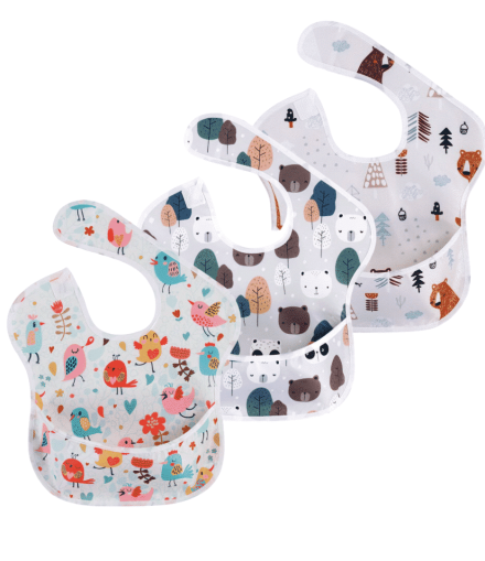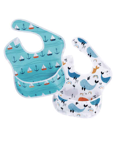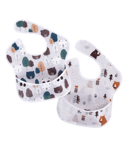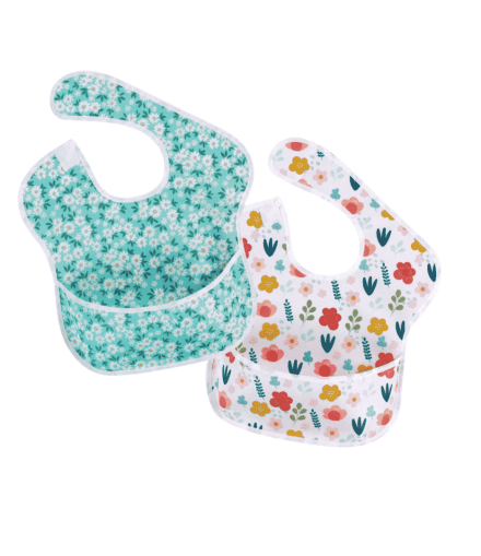 The Bib attaches over the back of the shoulder with hook and loop closure for a quick, adjustable and tug-proof fit. With a handy crumb catcher / catch-all pocket for containing spills. Made from lightweight, waterproof, easy-wipe, stain and odour resistant fabric.Â
