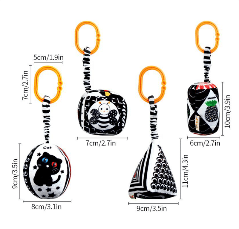 These black and white contrast rattle toys will get your baby practicing reaching up, building their hand eye coordination and visual tracking skills. Perfect for baby gyms, Car seats and strollers.